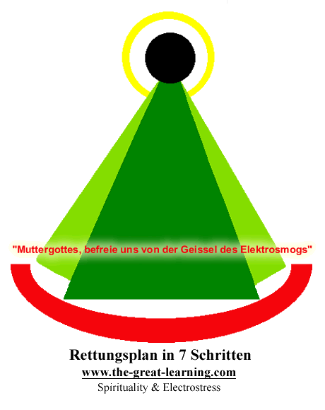 Ausarbeitung Ausgangssituation Einige wichtige sites: Die Große Mutter Unsere sites: Literatur über das Vakuum u.a.: Beten für die Welt Zusätzlich an das Basisgebet: "Muttergottes, befreie uns von der Geißel des Elektrosmogs" können auch folgende Mantra's und Gebete geübt werden: Mantra's: Auf dem Geleit eines Mantra's kommt man in die innere Tiefe bzw die Transzendenz. Ins Besondere wenn man es zusammen mit der Atem übt. Also "Om" (Bedeutung: "Kosmische Gebärmutter") im tiefsten Punkt der Ausatmung; "Stirb" in der Ausatmung, "Werde" in der Einatmung; "Große Mutter" in der Ausatmung, "Erbarme Dich unser" in der Einatmung usw. Selbstverständlich sind Mantra's die bei Dir aus der eigenen Seel emporkommen wohl besonders geeignet. Gebete: Du Isis sei gepriesen, Du die Große, Muttergottes, Herrin des Himmels, Gefährte und Königin der Götter. Gebet an Isis "Laß mich meditieren auf die Große Mutter, die das Dasein Selber ist, die auf dem Lotus sitzt, die den Tiger reitet, die die Laute spielt, deren göttliche Gestalt die Götter, die Demonen und Menschen schwindlich macht, deren Gebärmutter Zeit und Raum beinhaltet, die die kosmische Energie verkörpert, die in Ihren Händen die Bedingungen des Lebens und die Instrumente des Todes hält, die den Zyklus des Lebens webt, während Sie alles-was-ist-war-und wird schöpft und vernichtet, und die Ihre Verehrer stärkt und bereichert mit der Fähigkeit das unvorstellbare Universum zu akzeptieren und schätzen". Adi-Maya-Shakti "Unsere Herrin, die am Anfang unserer Religion stand (...), in Ihr, und in Ihrer Ehre wird, wenn es Gott behagt, das Ende unseres Lebens und das Ende unserer Religion sein, immer wenn es Gott behagt, daß es enden wird". Tägliches Gebet der Templeisen Heilige Maria, bete für uns, Heilige Muttergottes, Heilige Jungfrau der Jungfrauen, Mutter von Christus, Mutter der Kirche, Mutter der göttlichen Gnade, Allerreinste Mutter, Mutter unseres Schöpfers usw, usw. Aus der Litanei von Loreto Über die Kraft des Gebets und wie man sie sogar messen kann, siehe: http://www.spiralex.de/ Rubrik "Zur Besinnung" Internet Aktion Wie gesagt, besteht die Aktion darin, daß man das Bild der Muttergottes, zusammen mit dem ersten Absatz des "Rettungsplanes" (1), wie das in unserem E-mail dargestellt ist, per E-mail an soviel wie möglich Menschen schickt, zusammen mit einem Paar eigenen Sätzen, wobei man auf sehr persönlicher Art und Weise, die Notwendigkeit sich an dieser Aktion zu beteiligen, benachdruckt. Mit der Bitte ihrerseits die Nachricht wieder an soviel wie möglich Menschen zuzuschicken. Selbstverständlich wäre es zu begrüßen, wenn man die Karte nicht nur an Personen, sondern auch an Organisationen, Kirchen, Zentren, Behörden usw zuschicken würde. Wir hoffen, daß wir die Karte in kurzer Frist auch in anderen Sprachen zur Verfügung stellen können. Besonders wichtig ist das Zuschicken des Bildes mit dem vollständigen Text des "Rettungsplans" bei den lokalen, regionalen und nationalen Medien - TV, Radio, Zeitungen, Magazinen, Illustrierten usw.