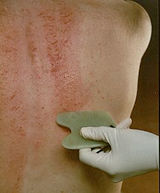 Die Haut rötet sich erheblich. Durch das Schaben auf der öligen Haut spürt der Patient