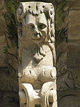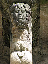 Santiago: Blattmasken am öffentlichen Gebäude mit ihren Gesichtern der Kirche zugewandt.